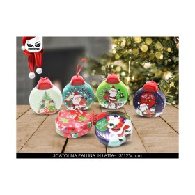 Scatoline di latta a forma di bocce con cordino per poterle appendere. Fantasie assortite. Dimensioni: 13x12x4 cm.